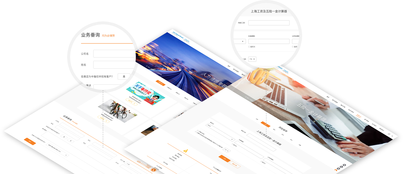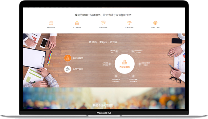 首頁(yè)中將業(yè)務(wù)分成“為企業(yè)服務(wù)”和“為員I服務(wù)”兩大類,利用流動(dòng)的線條將六大核心服務(wù)項(xiàng)目串聯(lián)起來(lái),融合頁(yè)面滾動(dòng)式加載效果,給用戶帶來(lái)全新的瀏覽體驗(yàn)。