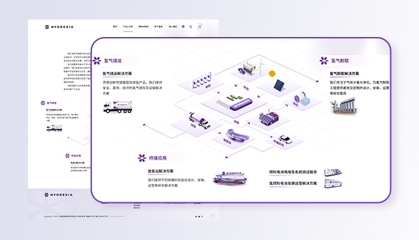 網(wǎng)站圍繞VI視覺體系,整體色調(diào)統(tǒng)一,簡約大氣,突出整體專業(yè)性。網(wǎng)頁運(yùn)用icon+動(dòng)態(tài)效果展示,加入手繪2.5D產(chǎn)品圖案,,細(xì)節(jié)突出了氫楓中國的可持續(xù)綠色能源理念形象。