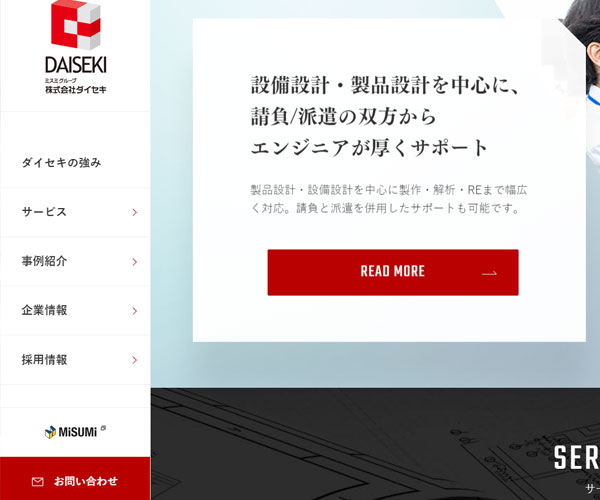 Dai-seki承包各類機(jī)械的設(shè)計制造工作,網(wǎng)站以典型的左導(dǎo)航右內(nèi)容的滑動來建成,