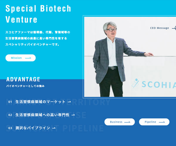 Scohia在心血管、代謝、腎臟方面有著高專注度的生物企業(yè),網(wǎng)站以不同的藍色基調(diào),