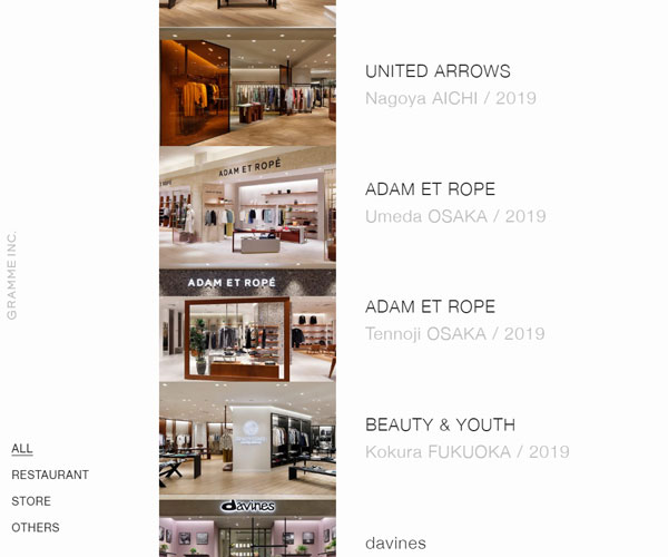 Gramme在多地開設(shè)精美的服飾店,網(wǎng)站的排版方式標(biāo)新立異,左右固定的文字形式