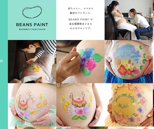 Beanspaint為孕婦畫人體彩繪,網(wǎng)站的整體建設風格較為獨特,左導航的點擊式交互,一張張精美