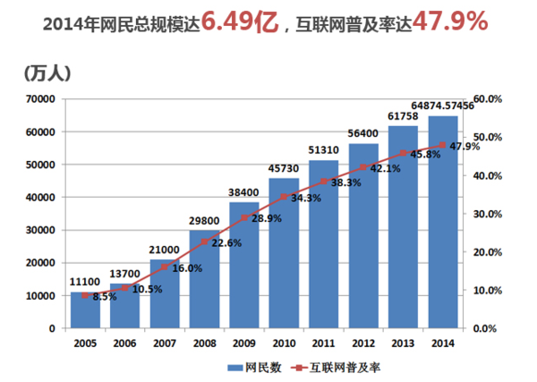1、據(jù)相關(guān)數(shù)據(jù)統(tǒng)計,截至2014年12月,我國網(wǎng)民規(guī)模達6.49億,互聯(lián)網(wǎng)普及率為47.9%(如下圖)。龐大的網(wǎng)民數(shù)量,你還擔心企業(yè)沒有客戶么。