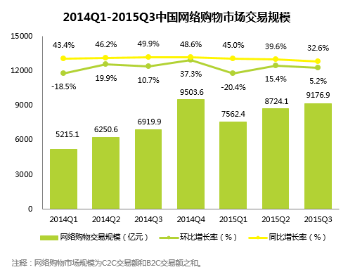 2、據(jù)相關(guān)最新數(shù)據(jù)顯示:2015Q3中國網(wǎng)絡購物市場交易規(guī)模達9176.9億元(如下圖),同比增長32.6%;根據(jù)國家統(tǒng)計局發(fā)布的數(shù)據(jù)顯示,2015Q3我國社會消費品零售總額達到7.5萬億元,網(wǎng)絡購物在社會消費品零售總額中的占比為12.3%,單季度滲透率繼續(xù)攀升。如此網(wǎng)絡交易增速,您還有什么理由不做網(wǎng)站呢。